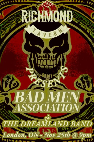 Bad Men Association and The Dreamland Band meet again in their string of tours at the Richmond Tavern in London. This is BMA’s last show on the Weekend Warrior Tour, and was BMA’s FIRST show on their tour last year. Come on out to see some real rock n roll. Tasty licks, and heavenly picks all night long with these talented musicians. COME SEE THE MAGIC on Saturday November 25th. Music starts at 9pm, and we will play until we have nothing left. This is it! TICKETS AT THE DOOR $15 cash or tickets online $15+tax See you there!